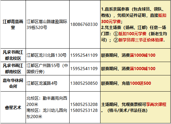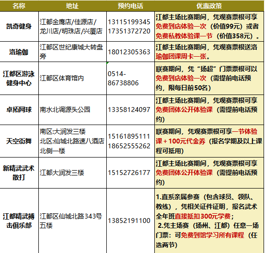 扬州市城市足球联赛期间,凯奇健身、洛瑜伽、青蓝画室等多家涵盖健身、球类、艺术等领域的运动与艺培机构,推出免费体验、课程优惠、场馆折扣等福利,让大家延续观赛热情,畅享活力健身与培训体验!