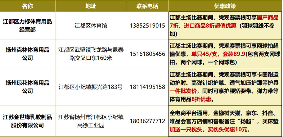 除此之外,还想支持本地农产品,感受江都烟火气?江都供销农产品展销中心主场日所有商品88折,不无需凭证,任意消费即可享受!用凭证,买特产、新鲜食材超实惠!赛后带点“江都味道”回家,给观赛之旅添一份温馨~