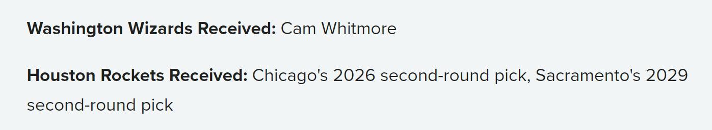 火箭队得到:公牛26年次轮签+国王29年二轮签。