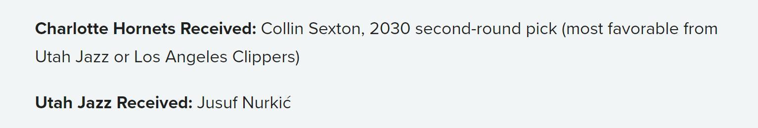 黄蜂得到:塞克斯顿+2030年次轮签(爵士和快船中更好那个);